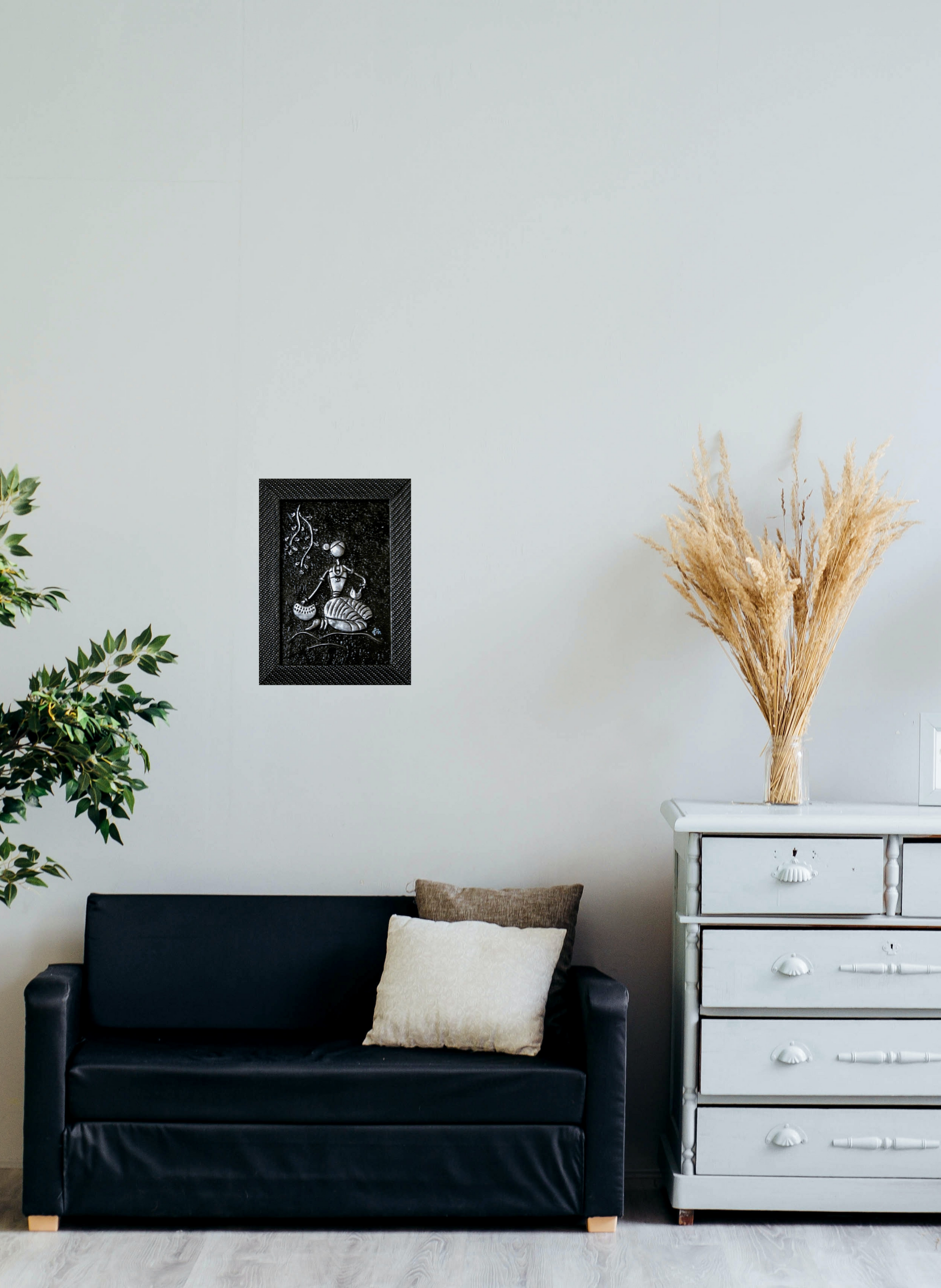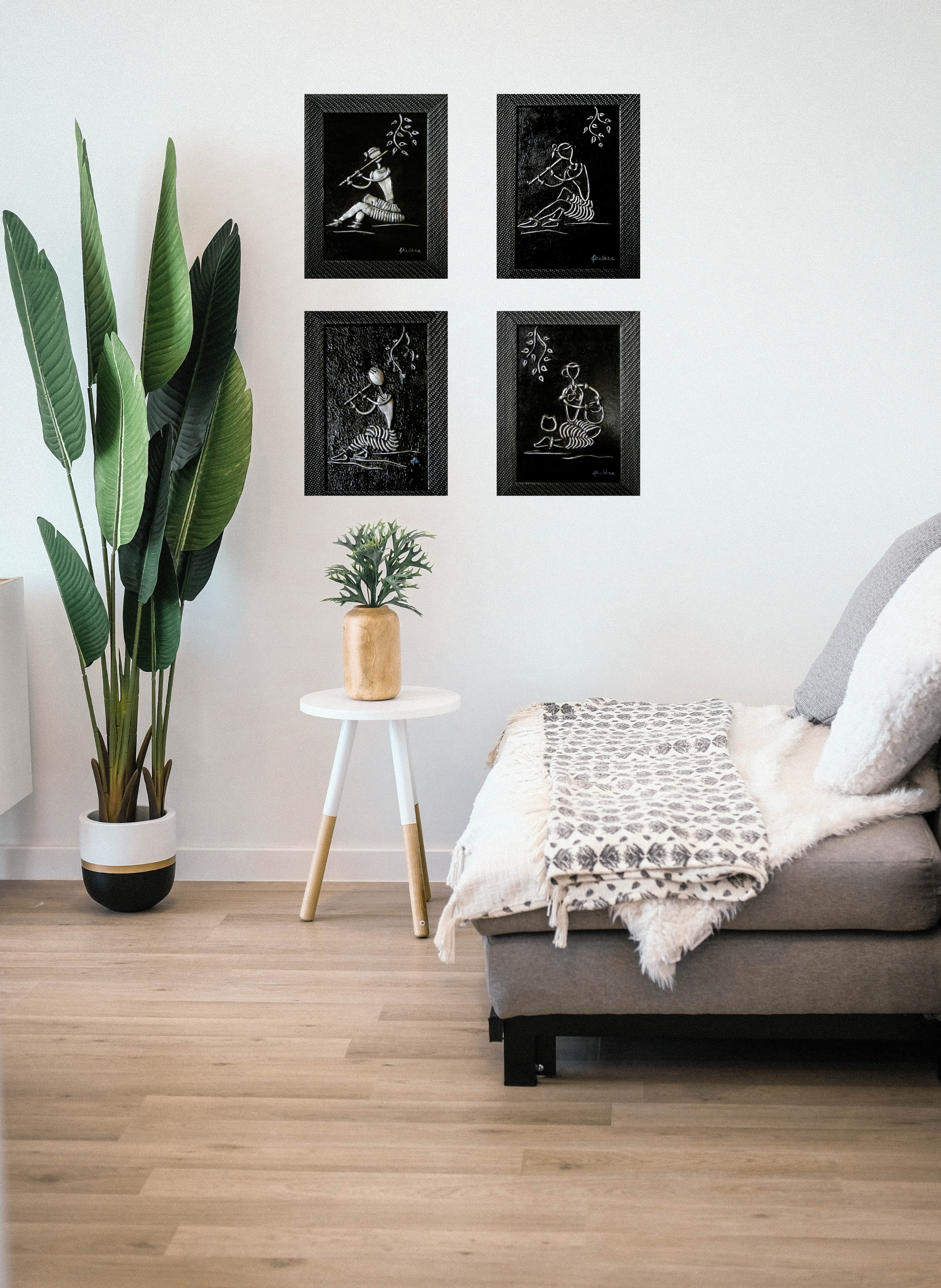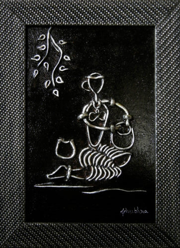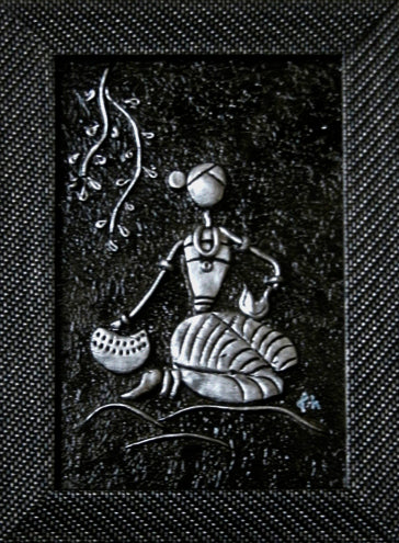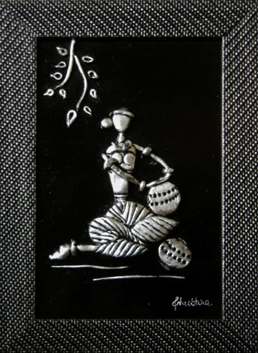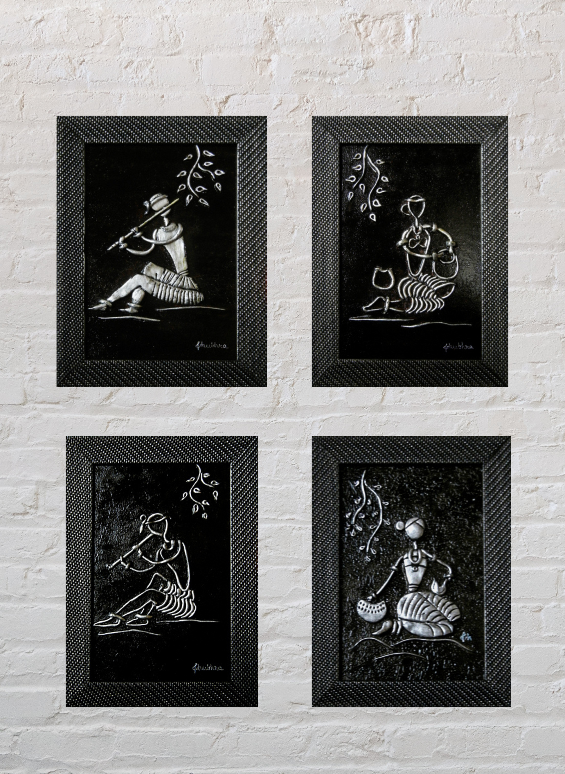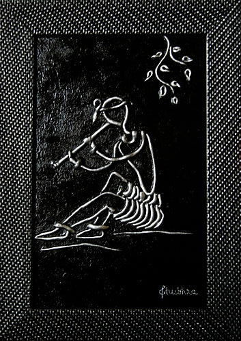 "In an exquisite mural art mural, villagers came alive in geometric shapes, their bodies swaying in rhythm to silver flutes' melody. Surrounding them, fellow villagers danced and clapped, their joy etched onto the earthen canvas. The scene, though simple, echoed a night of shared joy, the silver flutes symbolizing unity. The mural spun a tale of music and camaraderie, an earthly celebration mirrored by the cosmic dance above, all depicted in striking black and silver."