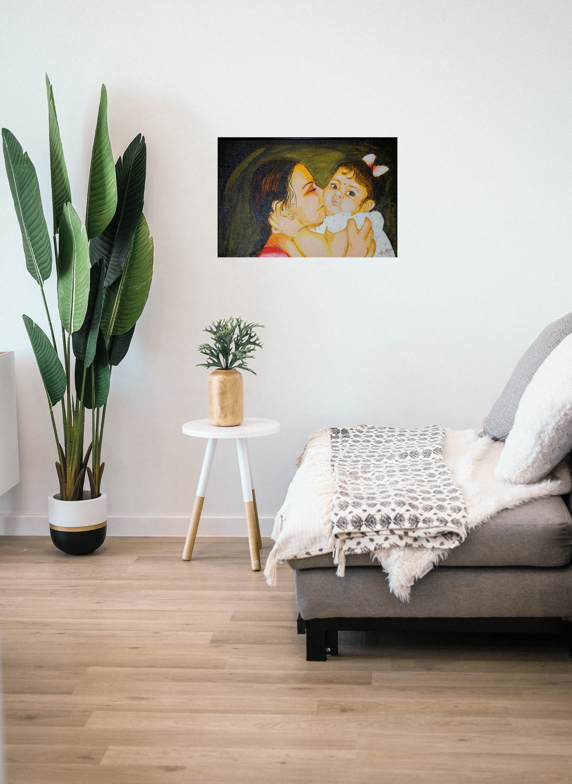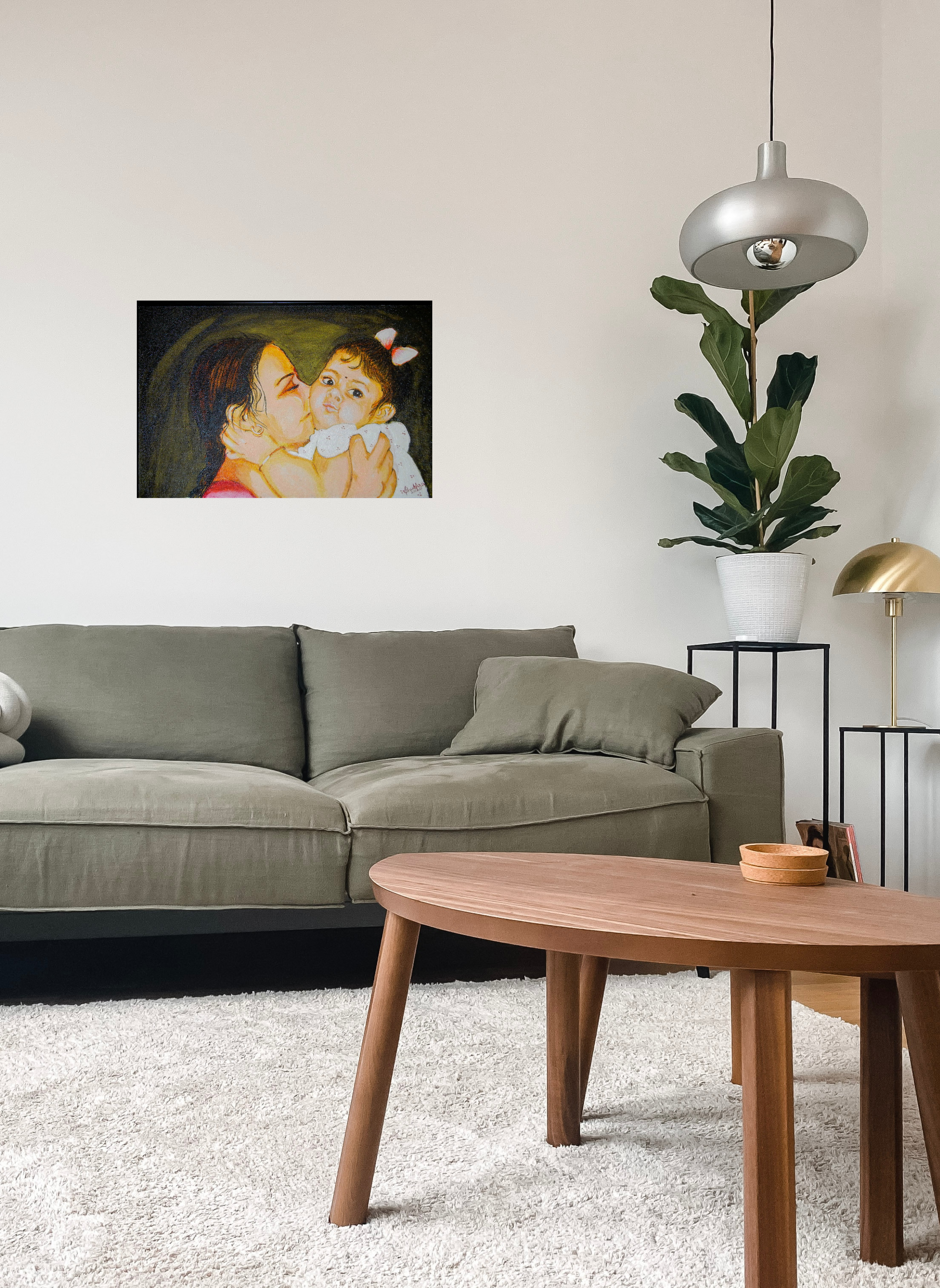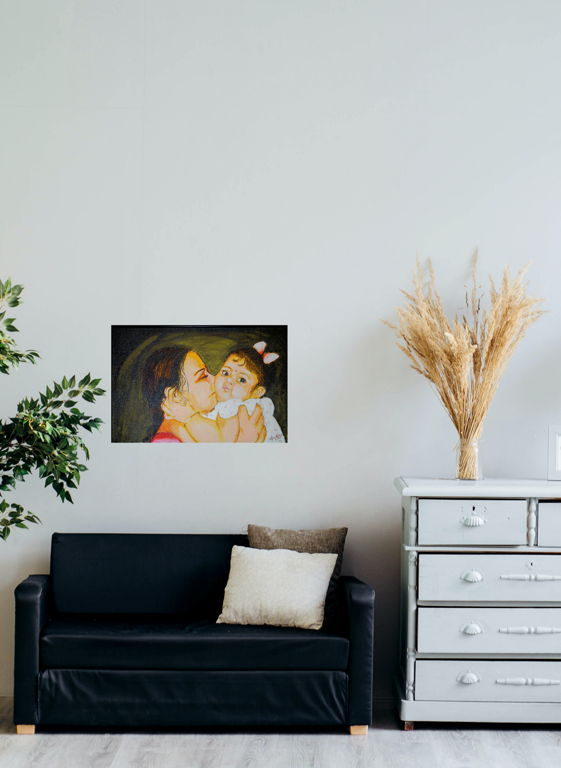 "A custom-made portrait capturing a mother kissing her child makes a heartwarming marriage gift for a daughter. It's a touching homage to her roots, a tangible reminder of maternal love. As she embarks on her new life, this intimate portrait, a symbol of timeless affection, serves as a cherished link to her past and a precious heirloom for her future."