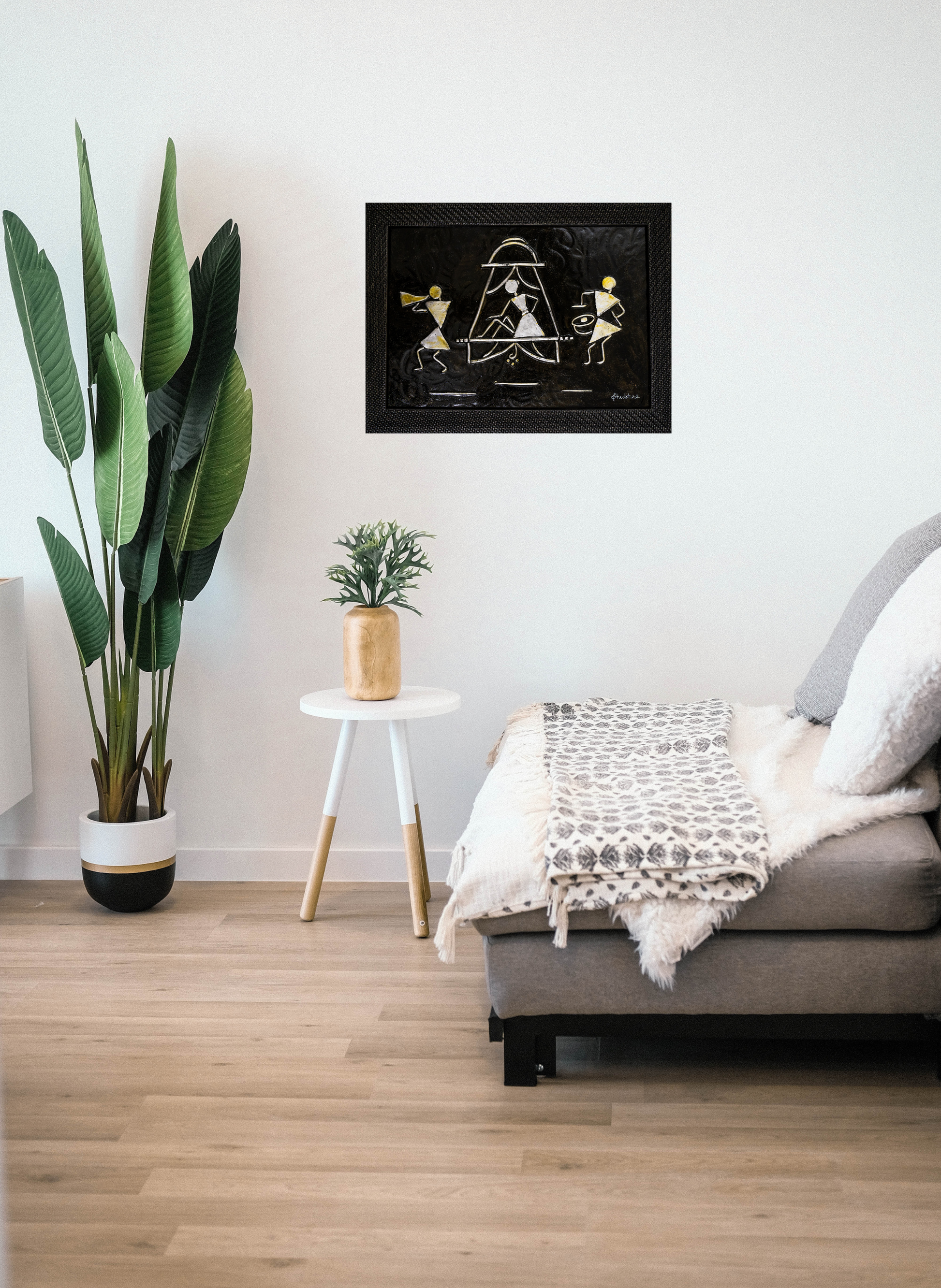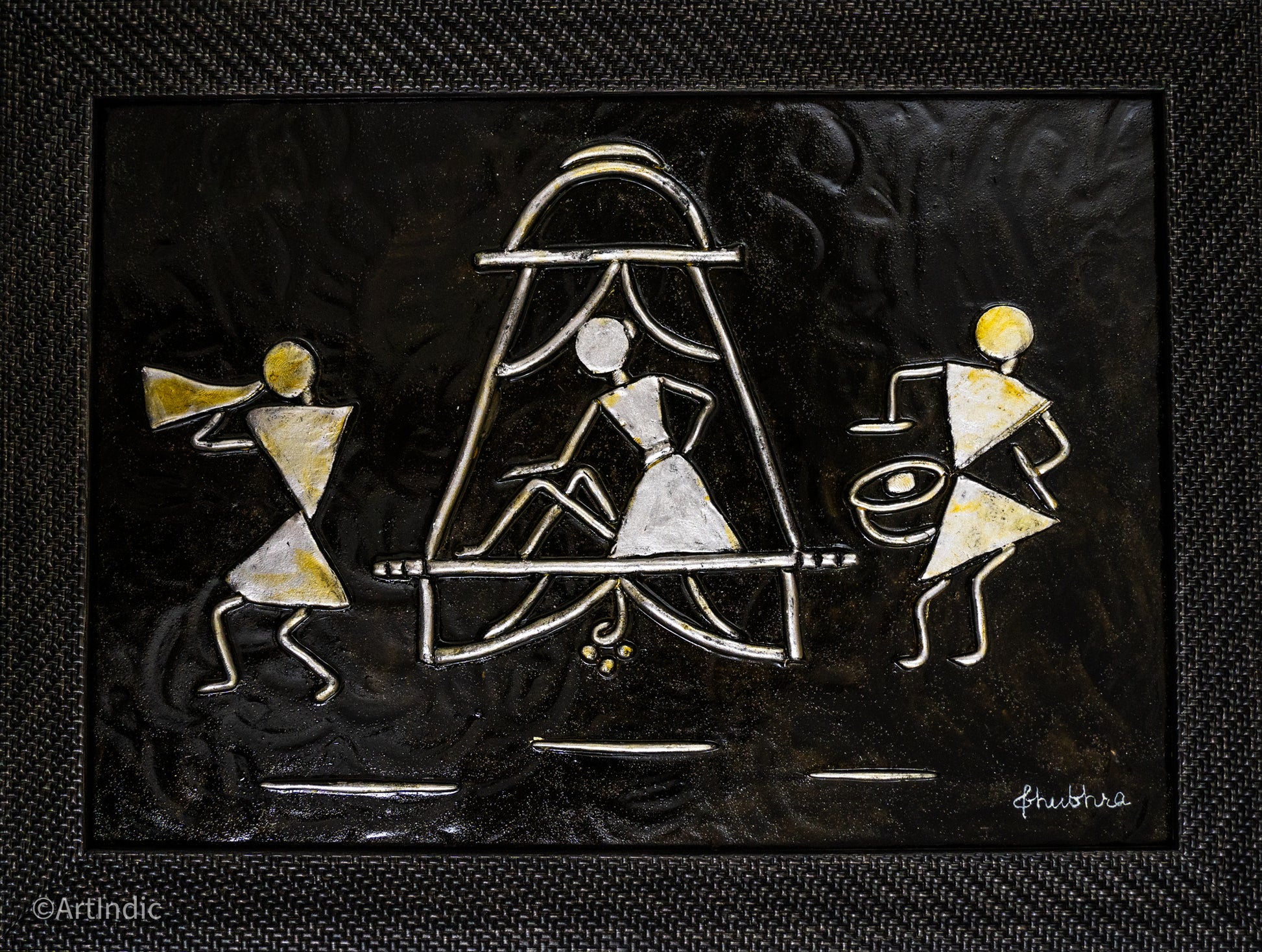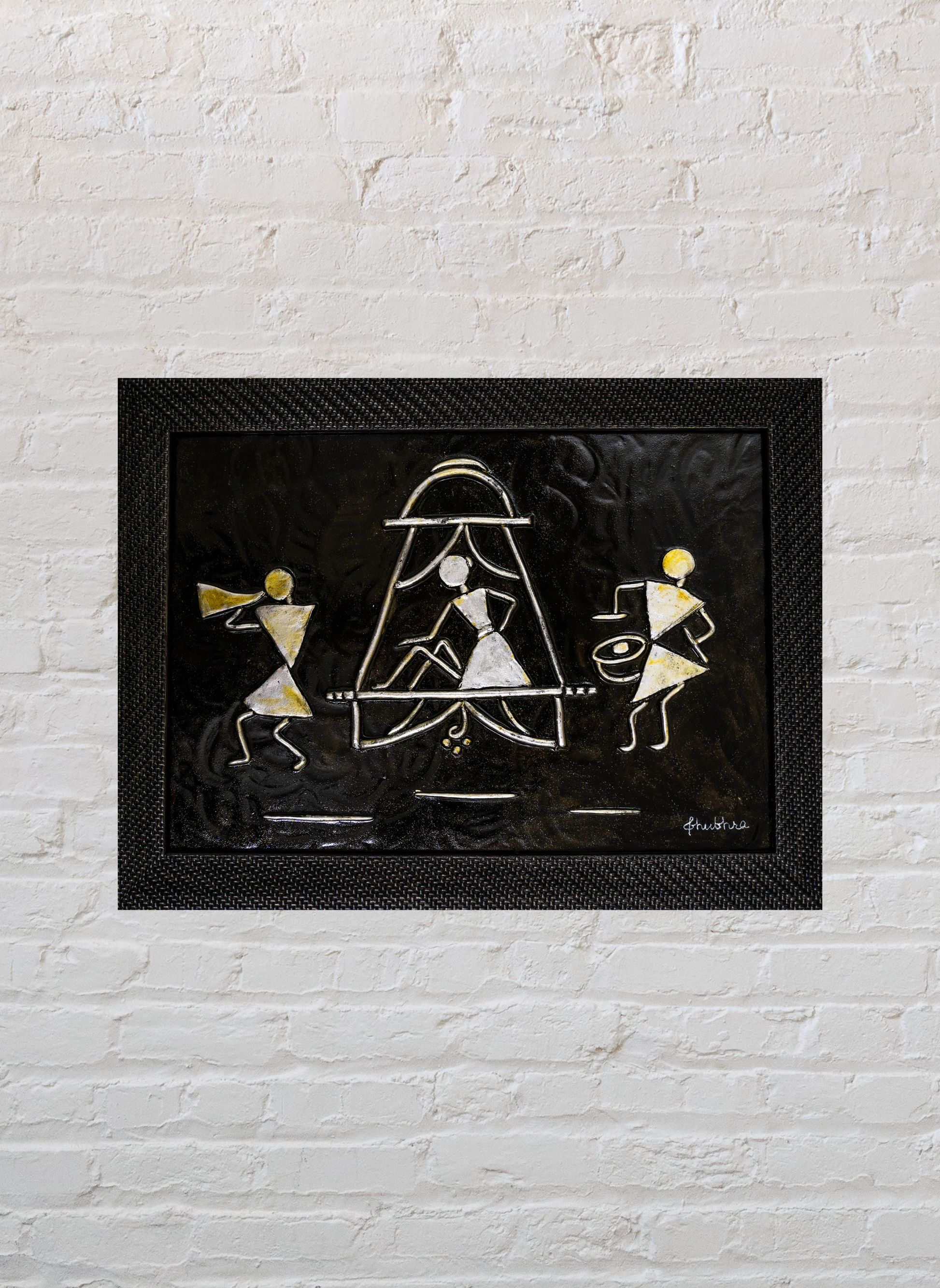 "In the traditional Warli art of Maharashtra, a captivating scene unfurls, featuring a majesticbride, her presence anchoring the composition. Surrounding her, dancers whirl and drummers pound out a rhythmic beat, their movements echoing the vibrancy of the community's celebrations."