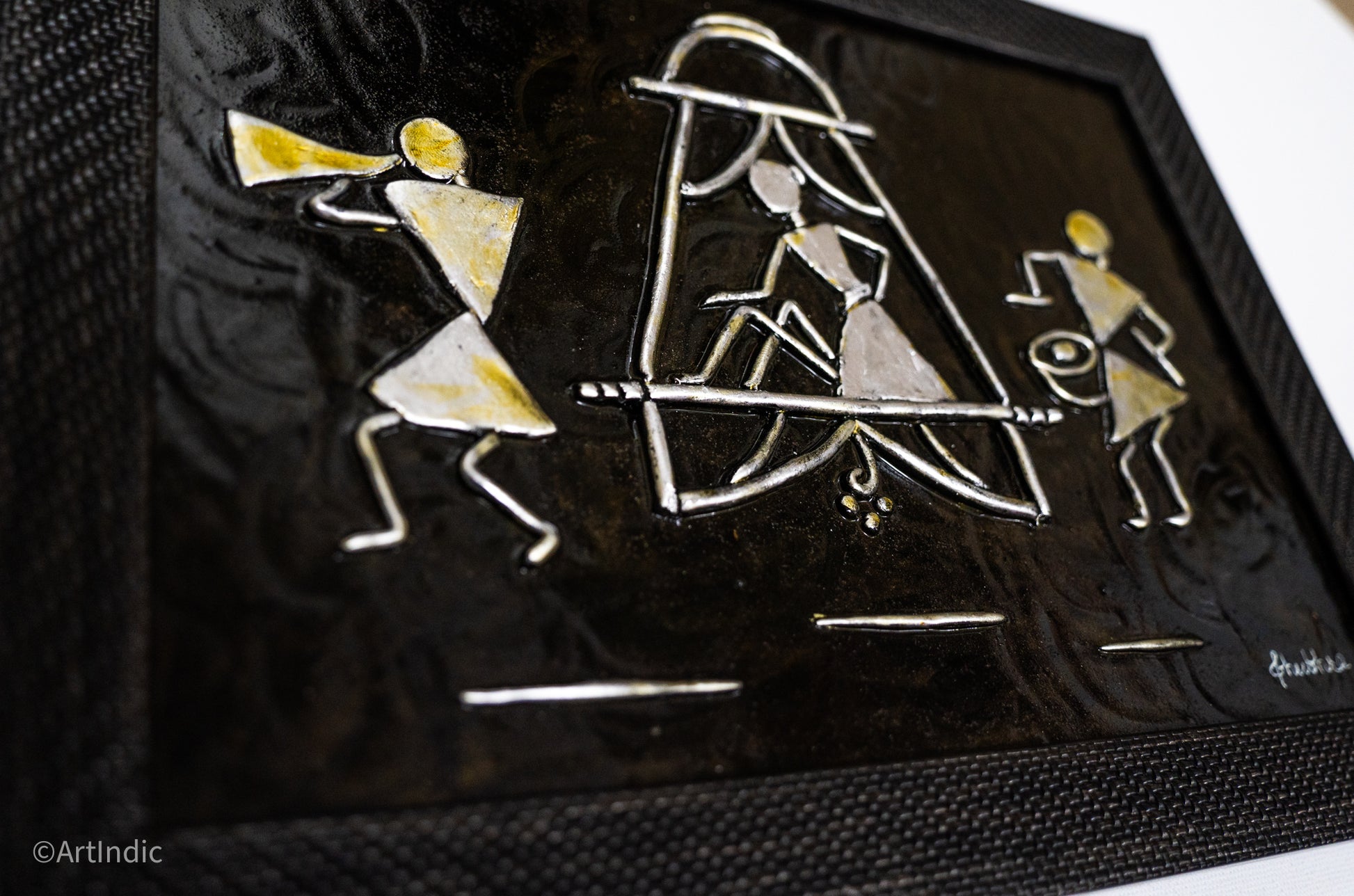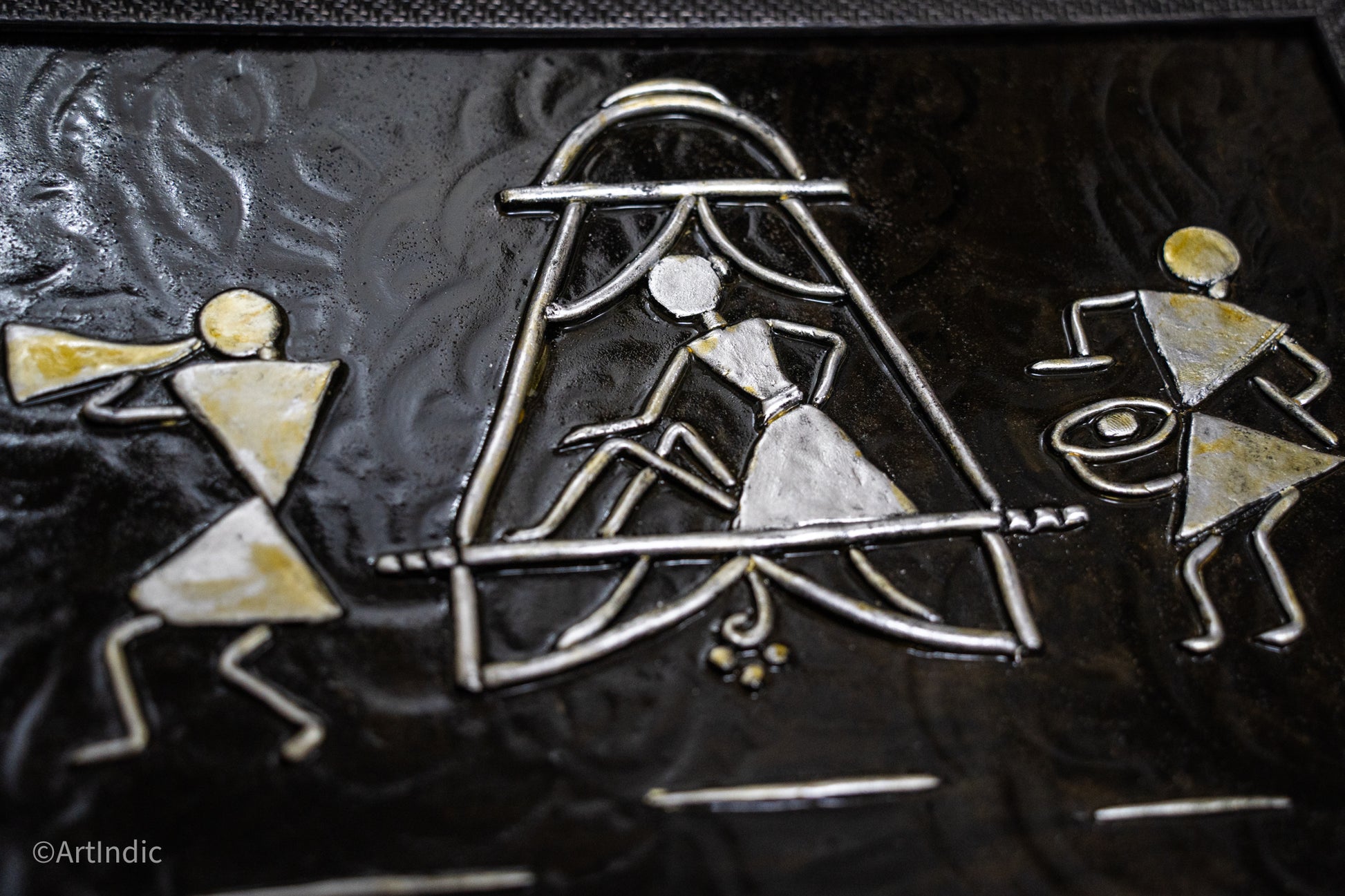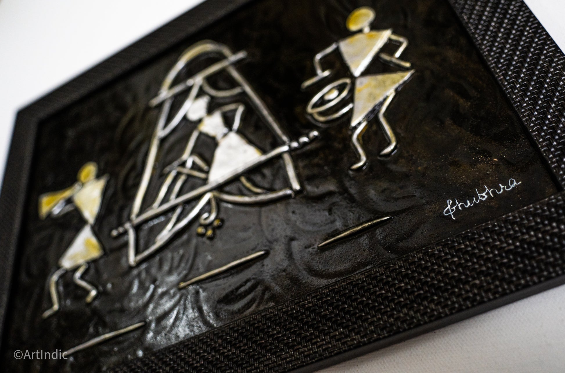 "In the traditional Warli art of Maharashtra, a captivating scene unfurls, featuring a majesticbride, her presence anchoring the composition. Surrounding her, dancers whirl and drummers pound out a rhythmic beat, their movements echoing the vibrancy of the community's celebrations."