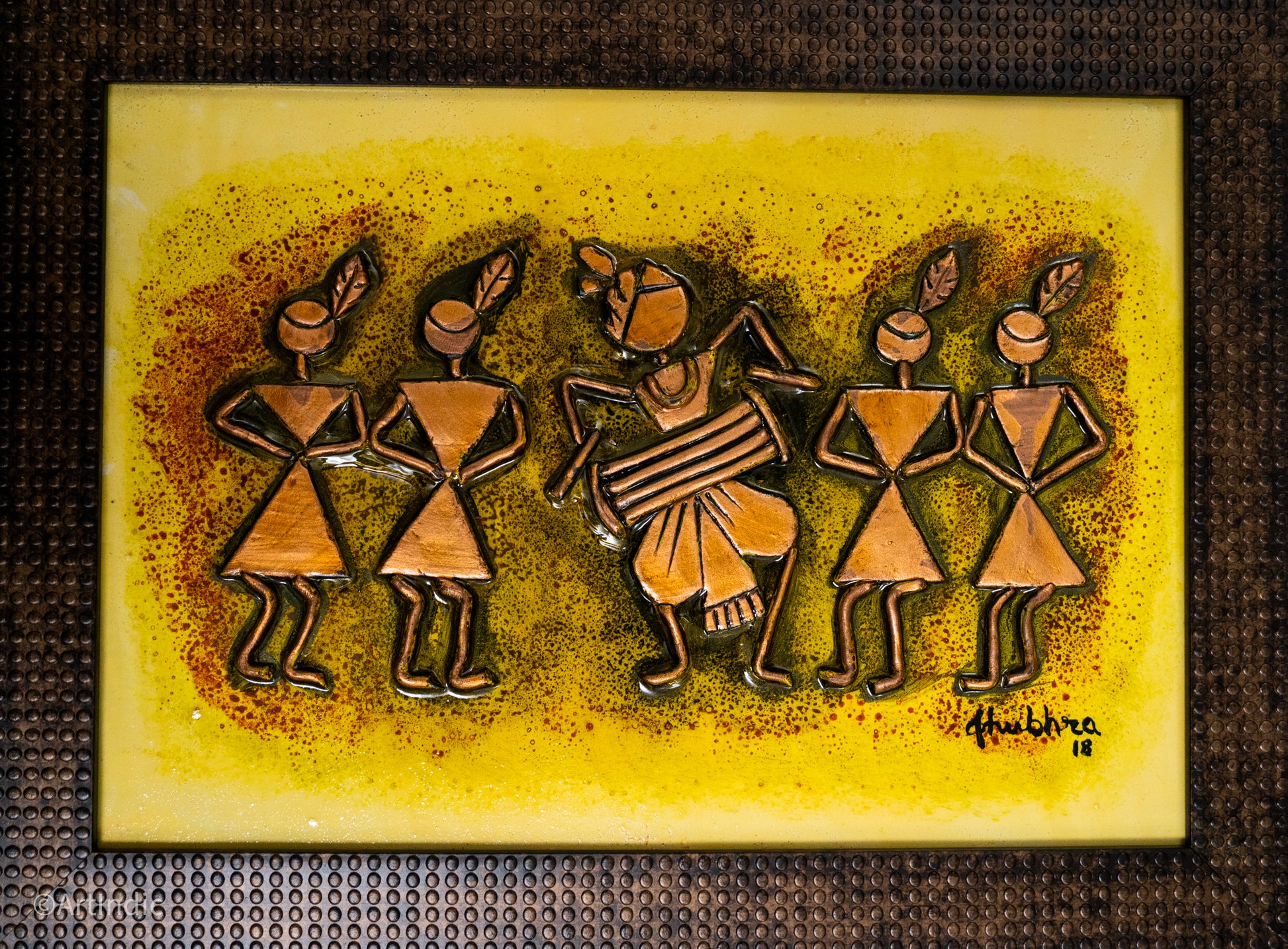 "A testament to the rich cultural tapestry of Maharashtra, Warli art often portrays scenes of joyous celebration. The heart-beating drum rhythms and the dancers moving in rhythmic harmony bring to life the sounds, movements, and energy of a traditional village gathering."